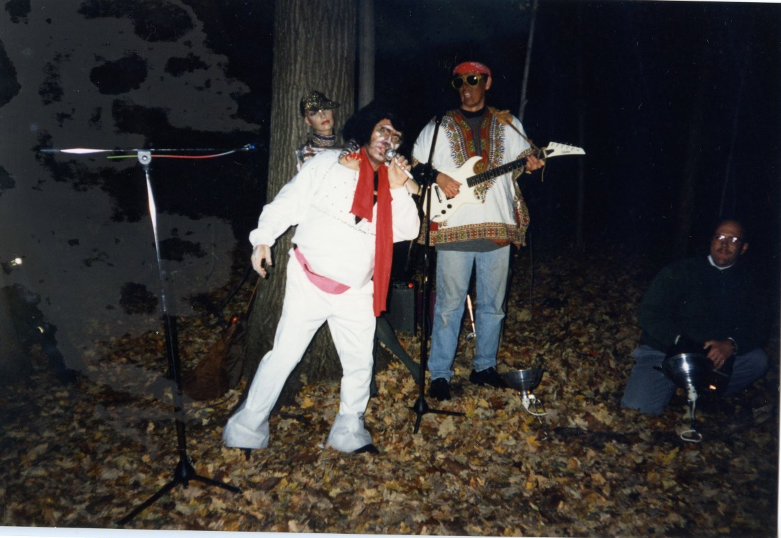 One year I took my kids & their friends to a really fun family themed haunted forest in a park nearby.  You walked part of the way and then enjoyed a Hayride back for warm apple cider and donuts!  This was the only picture I took of a Zombie Elvis & his band.  Yes that is a mannequin directly behind him.